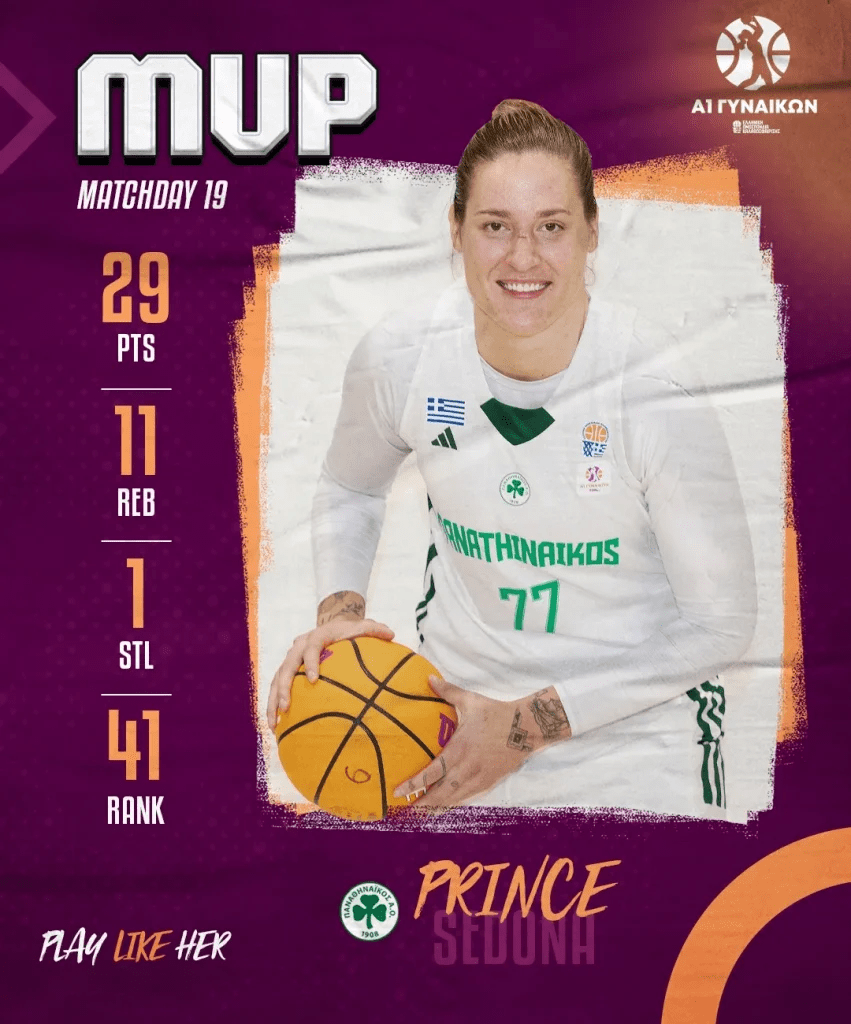 Η Σεντόνα Πρινς που αναδεικνύεται για δεύτερη φορά τη φετινή σεζόν MVP (κάτι ανάλογο είχε συμβεί και την 6η Αγωνιστική) στην νίκη του Παναθηναϊκού με 91-77 επί του ΠΑΟΚ είχε 29 πόντους, με 11 ριμπάουντ, ένα κλέψιμο, ένα κόψιμο συγκεντρώνοντας 41 στο σύστημα αξιολόγησης μετά από 24’41” συμμετοχής.