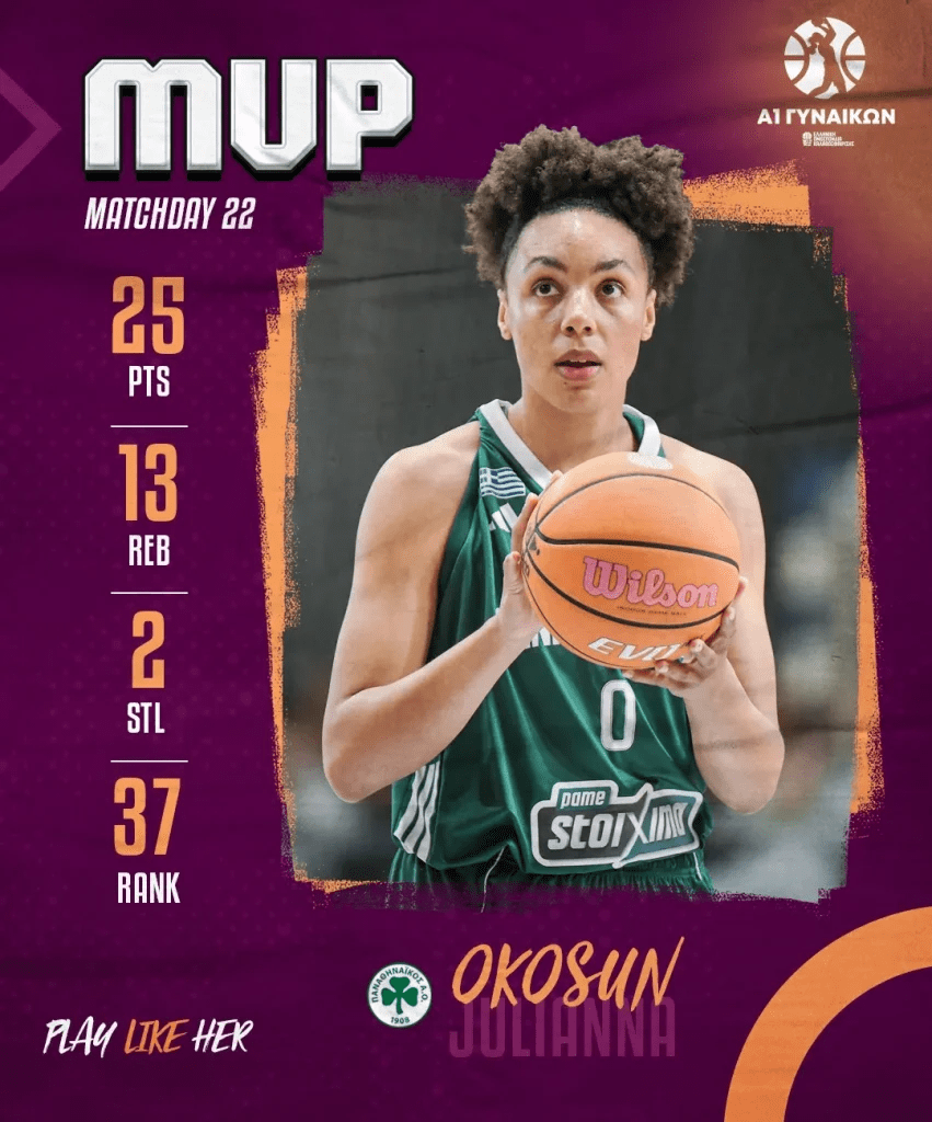 Η Τζουλιάνα Οκοσούν στην νίκη του Παναθηναϊκού με 88-60 απέναντι στον Πανσερραϊκό είχε 25 πόντους, 13 ριμπάουντ, 2 κλεψίματα και 37 στο σύστημα αξιολόγησης μετά από 21’51’’συμμετοχής.