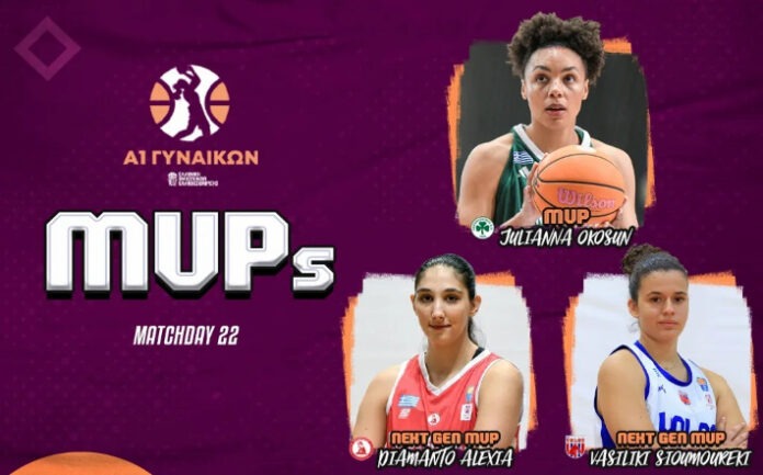 Η αυλαία της κανονικής περιόδου του πρωταθλήματος της Α1 Γυναικών έπεσε με την 22η Αγωνιστική και την Τζουλιάνα Οκοσούν του Παναθηναϊκού να αναδεικνύεται MVP, ενώ η Διαμάντω Αλεξιά του Πανσερραϊκού και η Βασιλική Σιουμουρέκη της Ανόρθωσης Βόλου μοιράστηκαν τη διάκριση της MVP Next Gen.