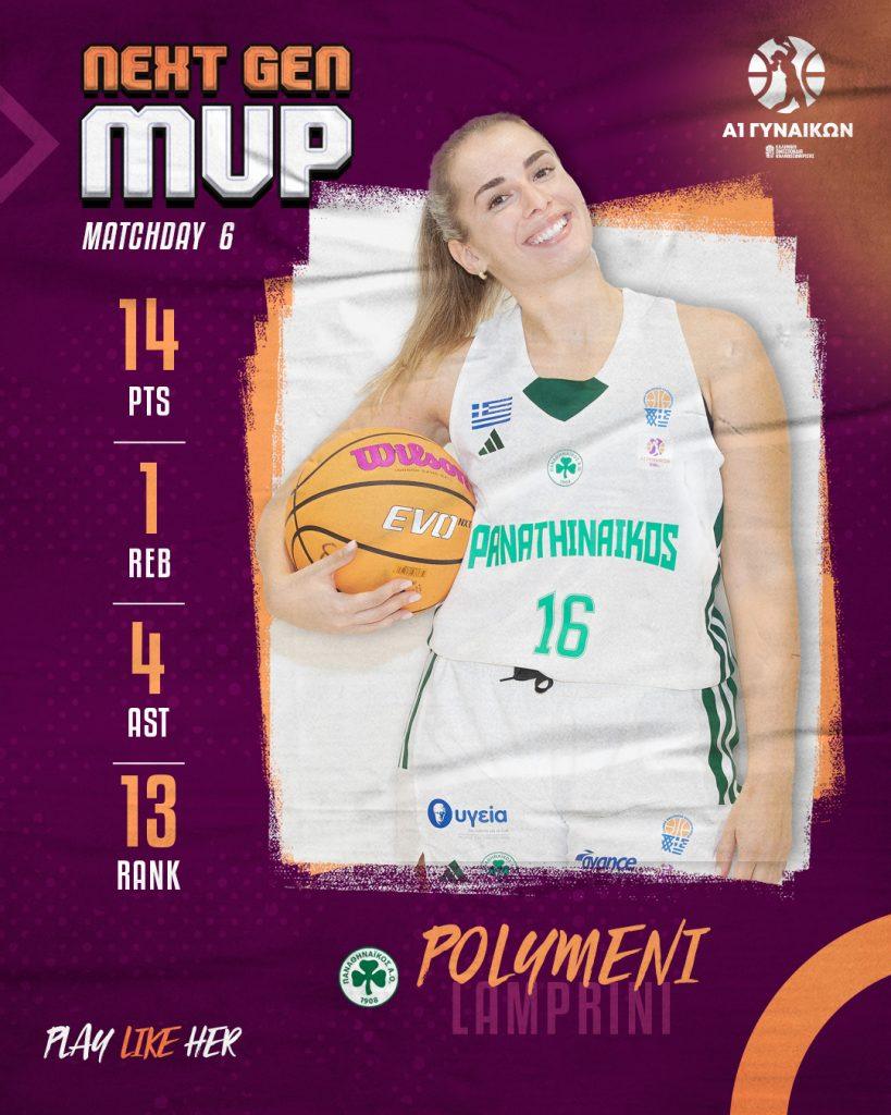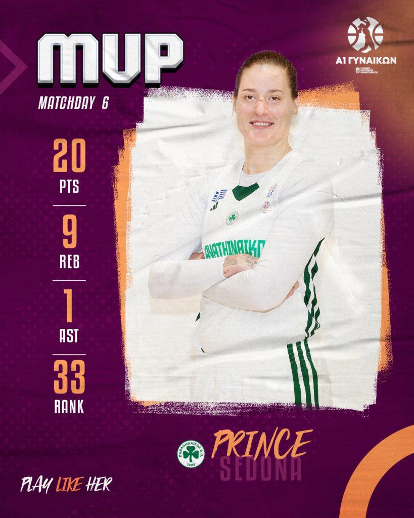 Οι MVP της αγωνιστικής ήταν… πράσινη υπόθεση, αφού τόσο η πολυτιμότερη όσο και η MVP Next Gen προέρχονται από τον Παναθηναϊκό και είναι αντίστοιχα οι Σεντόνα Πρινς και Λαμπρινή Πολυμένη.