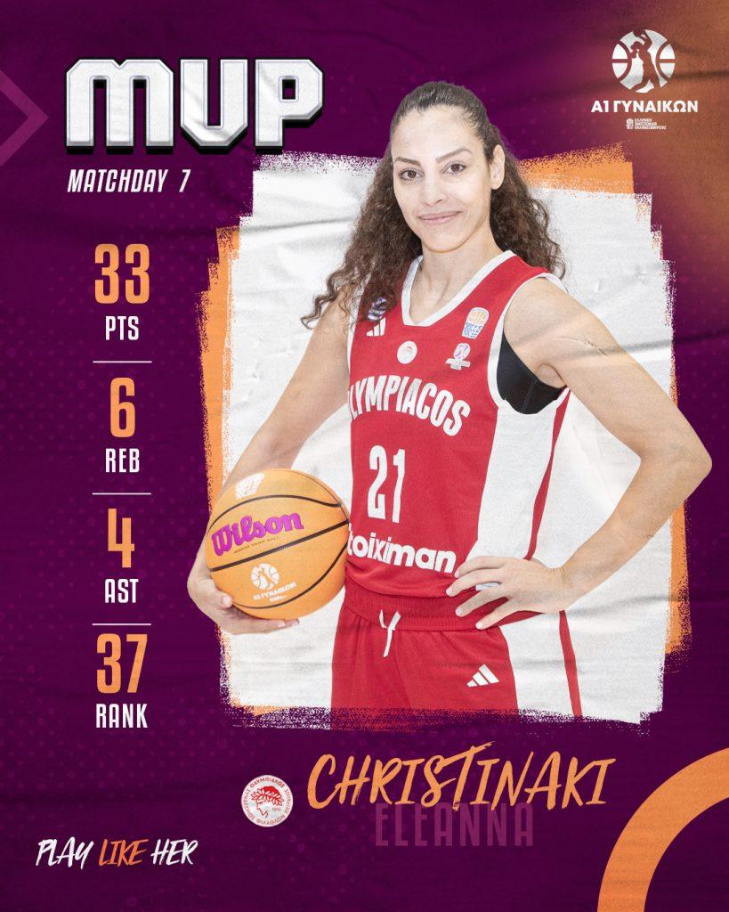 Η Ελεάννα Χριστινάκη στην επικράτηση του Ολυμπιακού με 97-80 επί της Ιωνίας είχε 33 πόντους με 6 ριμπάουντ, 4 ασίστ, ένα κλέψιμο και37 στο σύστημα αξιολόγησης μετά από 30’47’’συμμετοχής.