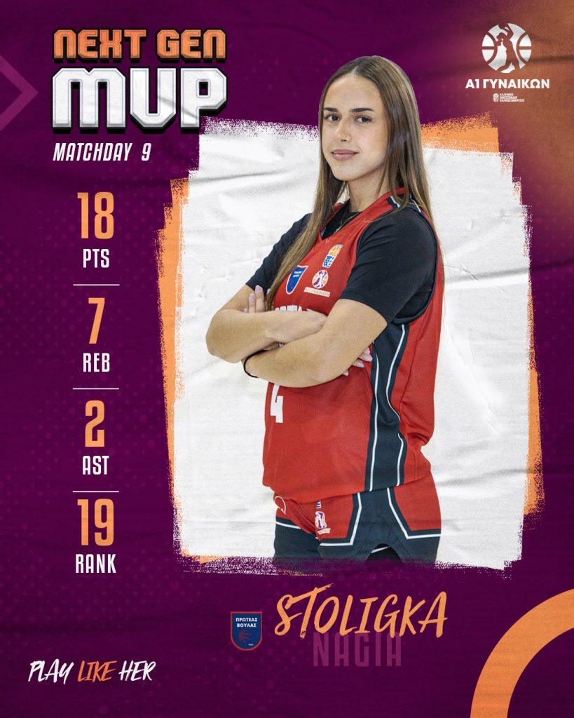 Από την άλλη η Νάγια Στολίγκα που αναδεικνύεται για τρίτη φορά MVP Next Gen (κάτι ανάλογο είχε καταφέρει την 3η και την 4η Αγωνιστική) στην ήττα του Πρωτέα Βούλας από τον ΠΑΣ Γιάννινα με 75-68 είχε 18 πόντους, 7 ριμπάουντ, 2 ασίστ, ένα κλέψιμο συγκεντρώνοντας 19 στο σύστημα αξιολόγησης μετά από 38’55’’ συμμετοχής.