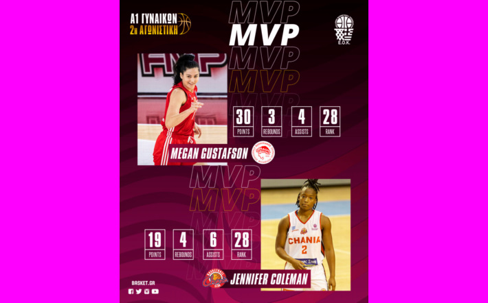 Δύο είναι οι αθλήτριες που μοιράστηκαν τον τίτλο της MVP τη 2η Αγωνιστική του πρωταθλήματος της Α1 Γυναικών. Ο λόγος για την Μέγκαν Γκούσταφσον του Ολυμπιακού και την Τζένιφερ Κόλεμαν των Χανίων.