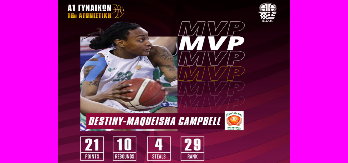 Η 16η Αγωνιστική του πρωταθλήματος της Α1 Γυναικών ολοκληρώθηκε με το εξ αναβολής παιχνίδι του Ολυμπιακού απέναντι στην Ελευθερία Μοσχάτου με τη Ντέστινι Κάμπελ να αναδεικνύεται MVP.