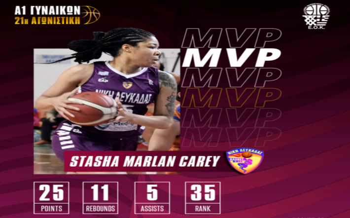 Από την Λευκάδα έρχεται η MVP της 21ης Αγωνιστικής του πρωταθλήματος της Α1 Γυναικών. Ο λόγος για την Στάσα Κάρεϊ, η οποία στην επικράτηση της Νίκης Λευκάδας με 68-56 επί του Παναθλητικού είχε 25 πόντους, 11 ριμπάουντ, 5 ασίστ, 4 κλεψίματα σε 35’31” χρόνο συμμετοχής φτάνοντας στο 35 στο σύστημα αξιολόγησης.