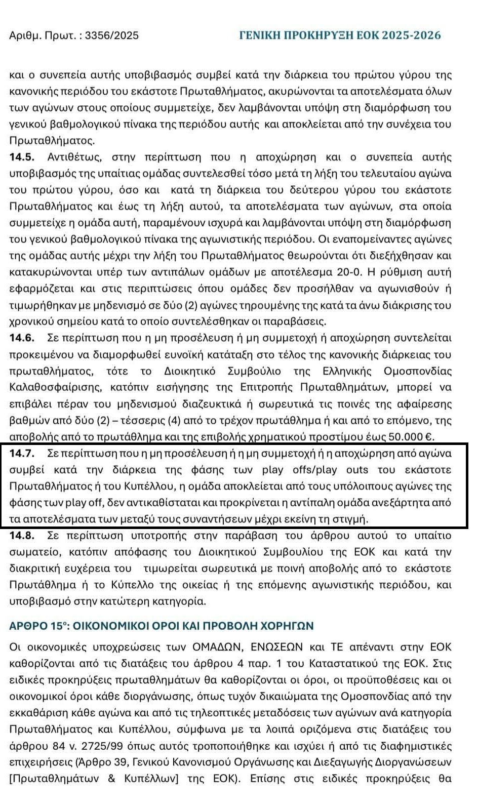Οπως σαφώς αναγράφεται στην παράγραφο 14.7, ομάδα που αποχωρεί αποκλείεται από τη συνέχεια και προκρίνεται η αντίπαλος, με τη διαφορά ότι εδώ δεν υπάρχει συνέχεια, αφού είναι οι τελικοί και το επόμενο βήμα είναι η ανάδειξη του πρωταθλητή.