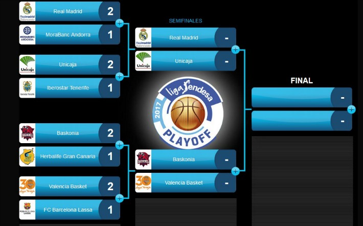 Ένα βήμα πιο κοντά στην τελική ευθεία μπαίνει το ισπανικό πρωτάθλημα. Οι ομάδες που είχαν το πλεονέκτημα της έδρας, υπερασπίστηκαν το «σπίτι» τους, έγιναν 12/12 εντός έδρας νίκες στους προημιτελικούς των playoffs και τα ζευγάρια των ημιτελικών είναι στη γραμμή εκκίνησης. Η Μπασκόνια θα αντιμετωπίσει τη Βαλένθια και η Ρεάλ Μαδρίτης την Ουνικάχα Μάλαγα, αναζητώντας η καθεμία τους τις τρεις νίκες που θα τις στείλουν στους τελικούς. Το πρόγραμμα των ημιτελικών ανακοινώθηκε από την ACB: