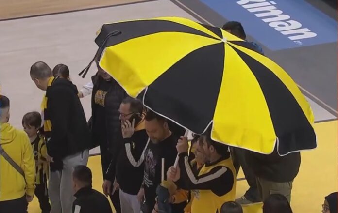 Μερικοί φίλαθλοι της ΑΕΚ φρόντισαν να... προφυλαχτούν από τη βροχή καλαθιών του Νάναλι κι εμφανίστηκαν στο παρκέ με ομπρέλα θαλλάσης.