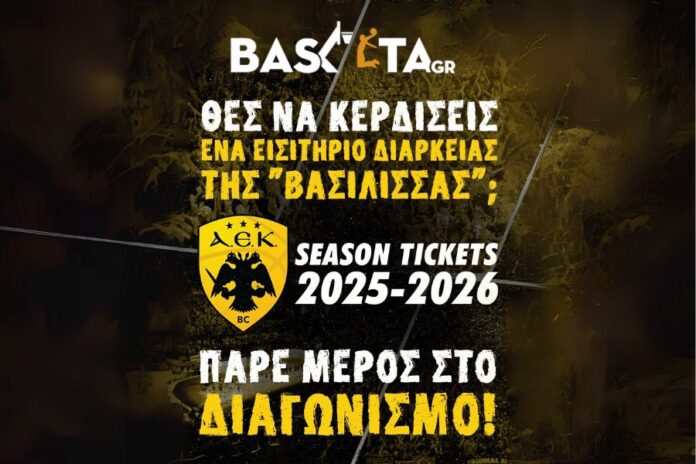 Η ΚΑΕ ΑΕΚ σε συνεργασία με το Basketa.gr προσφέρουν ΤΡΙΑ ΕΙΣΙΤΗΡΙΑ ΔΙΑΡΚΕΙΑΣ για την αγωνιστική περίοδο 2025-26, με τους τρεις τυχερούς να αναδεικνύονται μεταξύ αυτών που θα δηλώσουν συμμετοχή μέχρι τη Δευτέρα 29/9. Για να συμμετάσχετε στον διαγωνισμό δείτε τη σχετική ανάρτηση στη σελίδα μας στο Facebook ΕΔΩ και μετά τη λήξη του, τη Δευτέρα 29/09, θα ακολουθήσει η κλήρωση και η ενημέρωση των τυχερών, μαζί με τα στοιχεία που θα πρέπει να γνωστοποιήσουν για την έκδοση, βάσει όσων προβλέπει ο εν ισχύ αθλητικός νόμος.