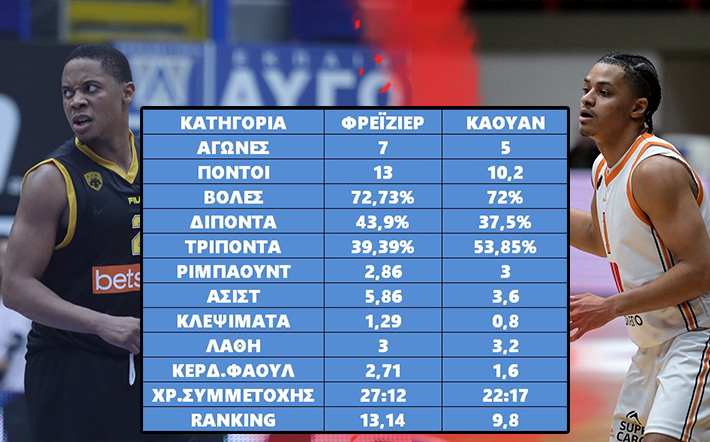 Η κόντρα των δύο Αμερικανών ωστόσο έχει ξεχωριστό ενδιαφέρον. Από τη μία πλευρά ο 32χρονος και με πολλές παραστάσεις Φρέιζιερ και από την άλλη ο 25χρονος Κάουαν που προσπαθεί να φτιάξει το όνομα και την καριέρα του. Η αποτύπωση των αριθμών τους παρουσιάζει τον βαθμό επίδρασης στο παιχνίδι των ομάδων τους…