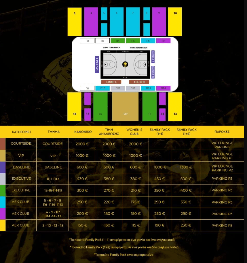H AEK BETSSON BC ενημερώνει επίσης ότι – στο πλαίσιο της ευρείας ανασυγκρότησης εν όψει της νέας περιόδου, που αφορά και στη βελτίωση των εγκαταστάσεων – ΟΛΟΙ οι κάτοχοι Διαρκείας θα έχουν ελεγχόμενη και φυλασσόμενη θέση parking , εντός των εγκαταστάσεων, ήτοι στα VIP, P1, P2, P3.