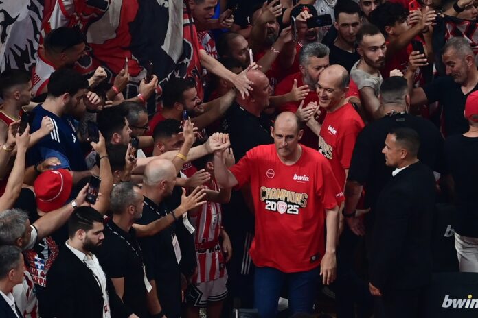 Παναγιώτης Αγγελόπουλος : «Πήραμε το πιο μάγκικο πρωτάθλημα της ιστορίας μας στα 100 χρόνια ιστορίας της ομάδας. Δεν τα καταφέραμε στο ημιτελικό της Ευρωλίγκας, χάσαμε το πρώτο ματς, αλλά όλοι μαζί δείξαμε τι σημαίνει Ολυμπιακός. Όλοι σας συγκεντρωθήκατε και κάνατε τους καλύτερους τελικούς, συγχαρητήρια και πάλι».