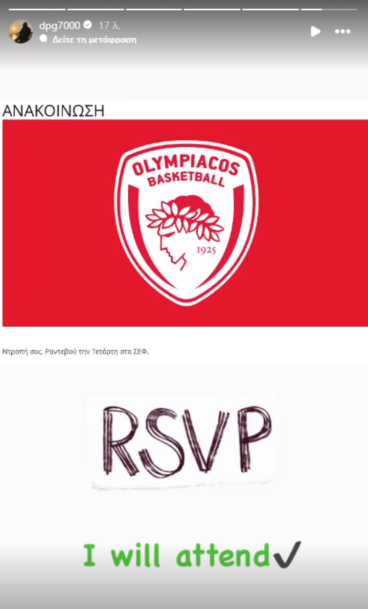 Συγκεκριμένα, ο ιδιοκτήτης του «τριφυλλιού», Δημήτρης Γιαννακόπουλος, απάντησε στην «ερυθρόλευκη» ΚΑΕ, η οποία είχε γράψει «Ντροπή σας. Ραντεβού την Τετάρτη στο ΣΕΦ», λέγοντας με ένα λιτό μήνυμα: «I will attend» (δηλαδή «Θα παρευρεθώ...», εννοώντας φυσικά πως θα δώσει το παρών με την ομάδα στο Game 4 των τελικών.