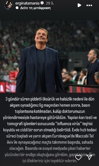 Η άμεση θεραπεία ξεκίνησε στο σπίτι και θα είμαι στον πάγκο της ομάδας μου στον επόμενο αγώνα στην EuroLeague κόντρα στην Μακάμπι Τελ Αβίβ, αύριο το βράδυ. Είδα ότι υπήρξε ανησυχία στα ΜΜΕ και στα social media. Είμαι καλά, σας ευχαριστώ για τις ευχές σας».