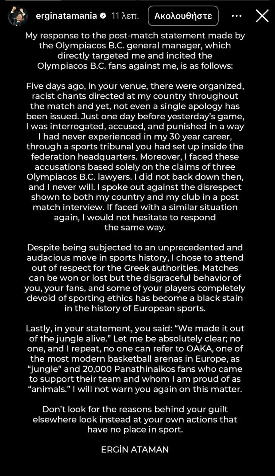 Μέσω του προσωπικού του λογαριασμού και με story στο Instagram θέλησε να απαντήσει ο Εργκίν Αταμάν σε όσα ανέφερε ο Νίκος Λεπενιώτης, Γενικός Διευθυντής του Ολυμπιακού.