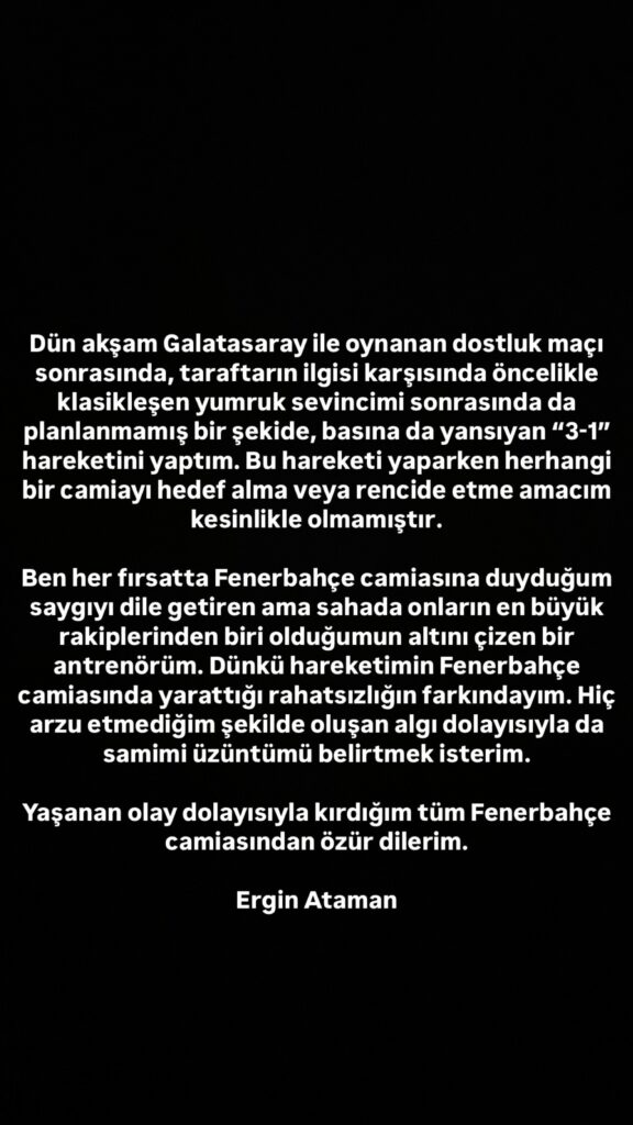 Συγγνώμη ζήτησε ο Εργκίν Αταμάν για την κίνηση που έκανε μετά τη λήξη του φιλικού του Παναθηναϊκού με τη Γαλατάσαραϊ, προς τους φιλάθλους της Φενέρμπαχτσε.