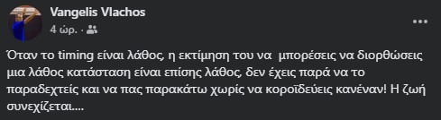 Ο έμπειρος προπονητής με ανάρτηση του παραδέχθηκε ότι δε μπόρεσε να αλλάξει τα δεδομένα στην ομάδα, αναφέροντας μάλιστα: «Όταν το timing είναι λάθος, η εκτίμηση του να μπορέσεις να διορθώσεις μια λάθος κατάσταση είναι επίσης λάθος, δεν έχεις παρά να το παραδεχτείς και να πας παρακάτω χωρίς να κοροϊδεύεις κανέναν! Η ζωή συνεχίζεται».
