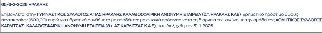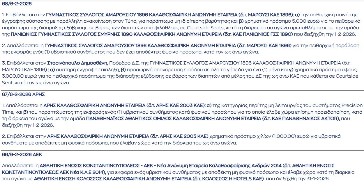 Αναλυτικά το γεμάτο σημερινό ποινολόγιο που ανακοινώθηκε: