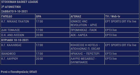 Ο ΕΣΑΚΕ ανακοίνωσε το πρόγραμμα της 2ης αγωνιστικής της Basket League. Όπως και στην πρεμιέρα, τρεις αγώνες θα διεξαχθούν το Σάββατο (9/10) και τρεις την Κυριακή (10/10). Το Σάββατο θα γίνουν οι αγώνες Ιωνικός Ν. - Άρης, Προμηθέας Π. - ΠΑΟΚ και ΑΕΚ - Λάρισα. Την Κυριακή θα διεξαχθούν οι αναμετρήσεις Κολοσσός Ρ. - Απόλλων Π, Ηρακλής -Περιστέρι και Λαύριο - Ολυμπιακός.