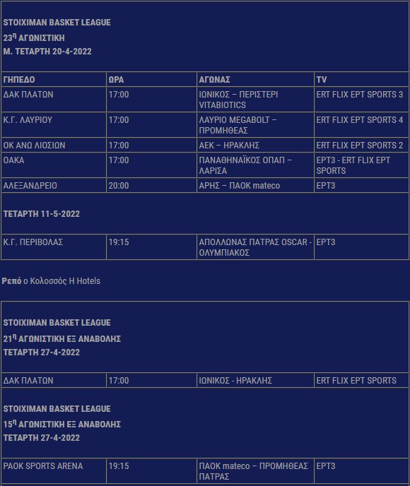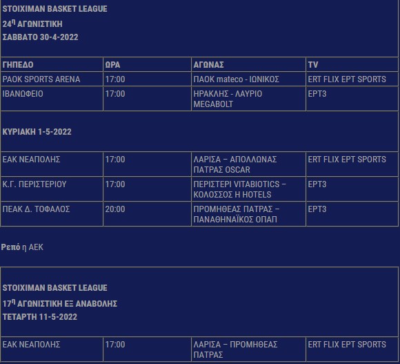 Οι ημερομηνίες πιέζουν ασφυκτικά για την ολοκλήρωση της κανονικής περιόδου της Basket League και ο ΕΣΑΚΕ ανακοίνωσε σήμερα το πρόγραμμα δύο αγωνιστικών, αλλά κυρίως και αρκετών αναβληθέντων αγώνων. Την Μεγάλη Τετάρτη υπάρχει (σχεδόν) πλήρης αγωνιστική με το ντέρμπι Αρη - ΠΑΟΚ να ξεχωρίζει.