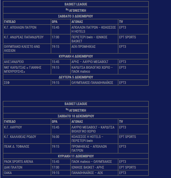 ΑρχικήΝΕΑGBL Basket League: Το πρόγραμμα των επόμενων 6 αγωνιστικών(pics) Θεοχάρης Λουλάκης 24/10/2022 22:25 FacebookTwitterPinterestWhatsApp Δείτε το αγωνιστικό και τηλεοπτικό πρόγραμμα από την 4η έως την 9η αγωνιστική της κανονικής περιόδου στην Basket League. Θεοχάρης Λουλάκης TagsBasket League FacebookTwitterPinterestWhatsApp ΔΙΑΒΑΣΤΕ ΕΠΙΣΗΣ Οι «ιτς» βρέθηκαν στη Θεσσαλονίκη μετά από 32 χρόνια 04/11/2025 11:31 Οι σημερινές (2/11) μεταδόσεις (vids) 02/11/2025 10:22 Χατζόπουλος: «Οι διαδικασίες με Μυστακίδη προχωράνε ομαλά» 01/11/2025 22:06 Ζντοβτς: «Η ομάδα δείχνει χαρακτήρα» (vid) 01/11/2025 21:38 Μίλιτσιτς: «Απέτυχα να αλλάξω τη νοοτροπία» (vid) 01/11/2025 21:19 Κέρδισε ο καλύτερος στο ντέρμπι της Θεσσαλονίκης (vid) 01/11/2025 21:06 Άρης – ΠΑΟΚ 73-78: Ο Τζάκσον έκρινε το ντέρμπι (pic, vids) 01/11/2025 20:25 Οι σημερινές (1/11) μεταδόσεις (vids) 01/11/2025 11:31 ΡΟΗ ΕΙΔΗΣΕΩΝ Λέικερς: Ο Ντόντσιτς κέρδισε και τους Σπερς (vids) 06/11/2025 09:14 Μπλέιζερς: Έσπασαν το αήττητο των Θάντερ από το -22 (vids) 06/11/2025 08:52 Καβαλίερς: Τρομερός ο Μίτσελ καθάρισε τους Σίξερς (vids) 06/11/2025 08:31 Νάγκετς: Ξανά «τριπλός» ο Γιόκιτς (vids) 06/11/2025 08:04 Άρης : Νουά για αρχή ενίσχυσης 06/11/2025 00:18 National League 2 (Βορράς – 2η αγ.): Άνετος στον Εύοσμο… για... 06/11/2025 00:11 Η στιγμή που ο Αταμάν μπερδεύτηκε και συνεχάρη τον Ολυμπιακό! (vid) 06/11/2025 00:07 Σλούκας: «Ντρέπομαι ως αρχηγός για την εικόνα, υπόσχομαι ότι ο Παναθηναϊκός... 06/11/2025 00:04