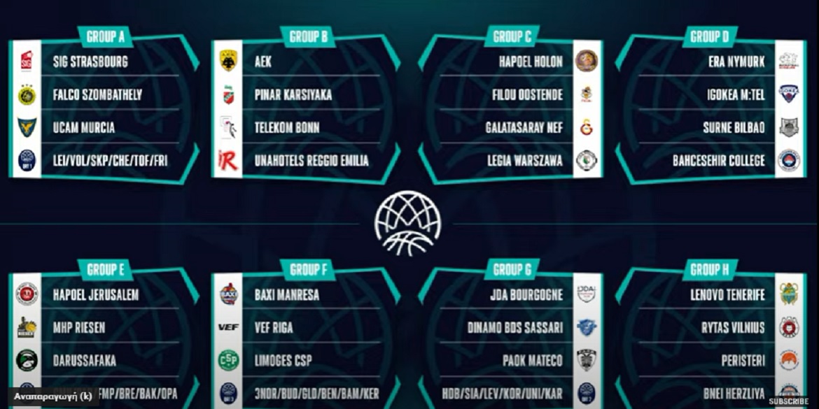 Το Περιστέρι του Βασίλη Σπανούλη θα αγωνιστεί στον όγδοο όμιλο με την πρωταθλήτρια Τενερίφη από την Ισπανία, την Ρίτας από την Λιθουανία και την Μπνέι Ερτζελία από το Ισραήλ.