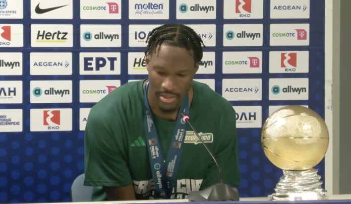 Ο Αμερικάνος φόργουορντ στο πρώτο του «αιώνιο» ντέρμπι αναδείχθηκε MVP κι ευχαρίστησε συμπαίκτες, τεχνικό επιτελείο και τον Δημήτρη Γιαννακόπουλο για την εμπιστοσύνη που έδειξαν στο πρόσωπο του στις πρώτες του ημέρες με την πράσινη φανέλα.