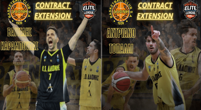 Η συνταγή της επιτυχίας δεν αλλάζει στη Δάφνη, τουλάχιστον όχι οι μεγάλοι πρωταγωνιστές της. Οι "κιτρινόμαυροι" πανηγύρισαν την άνοδό τους στην Elite League και σήμερα ανακοίνωσαν την ανανέωση της συνεργασίας με δύο "πυλώνες" της, τον Αντριάνο Τοπάλι (1,92 - 31 ετών) και τον... μετρ των ανόδων, Βαγγέλη Καράμπουλα (2,00 - 44 ετών).