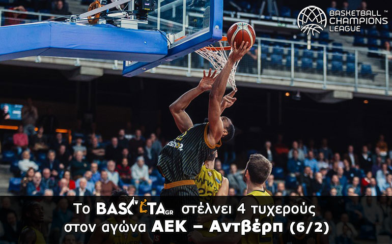 Η εντυπωσιακή πορεία της ΑΕΚ στην φάση των ομίλων του Basketball Champions League ολοκληρώνεται στο ΟΑΚΑ με αντίπαλο την Αντβέρπ (Τετάρτη 6/2, 21.30) και το Basketa.gr προσφέρει τέσσερα εισιτήρια και για αυτόν τον αγώνα, όπως σε όλους τους προηγούμενους εντός έδρας των ελληνικών ομάδων στην διοργάνωση.