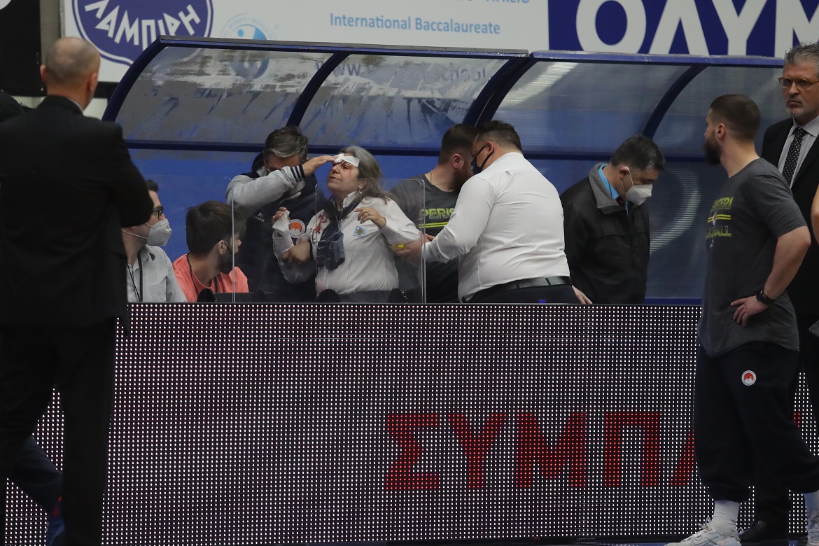Ενα προστατευτικό πλέξιγκλας έπεσε στο μέτωπο της σημειώτριας του φύλλου αγώνα, η οποία τραυματίστηκε στο μέτωπο που μάτωσε και αποχώρησε εσπευσμένα για να της παρασχεθούν οι πρώτες βοήθειες.