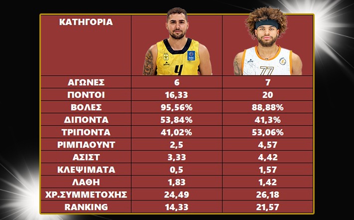 Ο Χέιλ είναι πρώτος σε εύστοχα τρίποντα στη φετινή Basket League έχοντας 3,71 ανά αγώνα ενώ ο Τολιόπουλος είναι στην 7η θέση παρότι έχασε ένα παιχνίδι, ευστοχώντας 2,66 φορές ανά αγώνα.