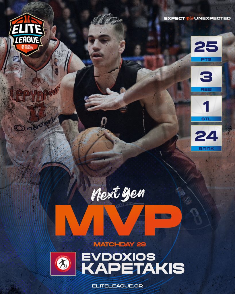 Πολυτιμότερος παίκτης κάτω των 23 ετών αναδείχθηκε για τρίτη φορά τη φετινή περίοδο ο Ευδόξιος Καπετάκης κερδίζοντας το βραβείο MVP Next Gen. Ο 20χρονος γκαρντ των Σοφάδων στη νίκη επί του Πανερυθραϊκού (78-88) συγκέντρωσε 24 βαθμούς στο σύστημα αξιολόγησης έχοντας 25 πόντους με 5/6 βολές, 4/8 δίποντα και 4/4 τρίποντα, μαζί με 3 ριμπάουντ, 1 κλέψιμο και 5 κερδισμένα φάουλ σε 29:25.