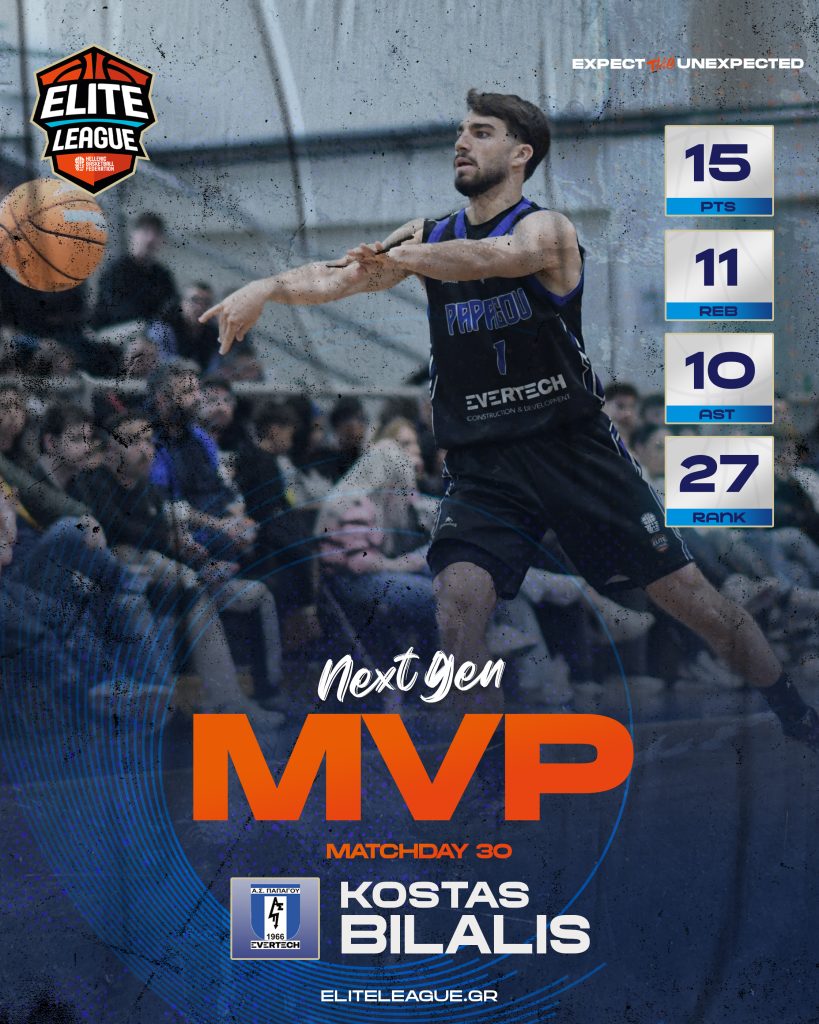 Πολυτιμότερος παίκτης κάτω των 23 ετών αναδείχθηκε για έκτη φορά τη φετινή περίοδο ο Κωνσταντίνος Μπιλάλης κερδίζοντας το βραβείο MVP Next Gen. Ο 22χρονος γκαρντ του Evertech Παπάγου στη νίκη επί των Vikos Φalcons (72-79) συγκέντρωσε 27 βαθμούς στο σύστημα αξιολόγησης κάνοντας τριπλ νταμπλ με 15 πόντους (1/2 βολές, 1/4 δίποντα και 4/6 τρίποντα), μαζί με 11 ριμπάουντ, 10 ασίστ και 3 κερδισμένα φάουλ σε 33:08.