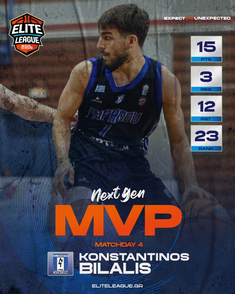 Πολυτιμότερος παίκτης κάτω των 23 ετών αναδείχθηκε ο Κωνσταντίνος Μπιλάλης κερδίζοντας το νεοσύστατο βραβείο MVP Next Gen. Ο 21χρονος γκαρντ στη νίκη του Evertech Παπάγου επί της Λαυρίου Boderm (88-90) συγκέντρωσε 23 βαθμούς στο σύστημα αξιολόγησης έχοντας 15 πόντους με 3/4 βολές, 0/2 δίποντα και 4/7 τρίποντα, μαζί με 3 ριμπάουντ, 12 ασίστ και 3 κερδισμένα φάουλ σε 27:29.