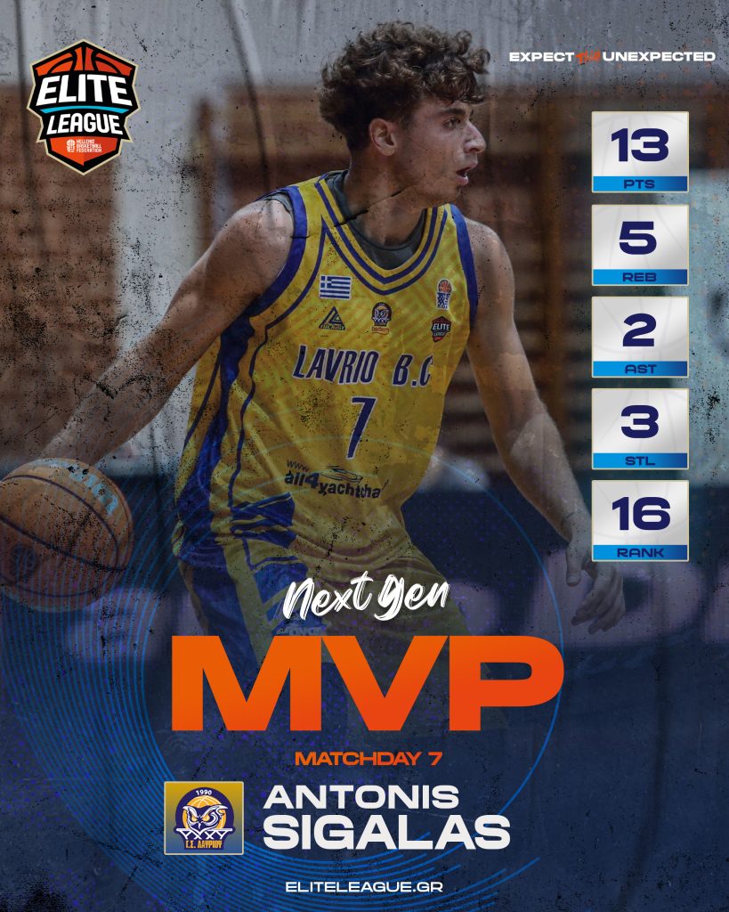 Πολυτιμότερος παίκτης κάτω των 23 ετών αναδείχθηκε ο Αντώνης Σιγάλας κερδίζοντας το νεοσύστατο βραβείο MVP Next Gen. Ο 21χρονος γκαρντ στη νίκη του Λαυρίου Boderm επί της Νίκης Βόλου (82-69) συγκέντρωσε 16 βαθμούς στο σύστημα αξιολόγησης έχοντας 13 πόντους με 2/4 δίποντα και 3/5 τρίποντα, μαζί με 5 ριμπάουντ, 2 ασίστ, 3 κλεψίματα και 1 κερδισμένο φάουλ σε 18:06.