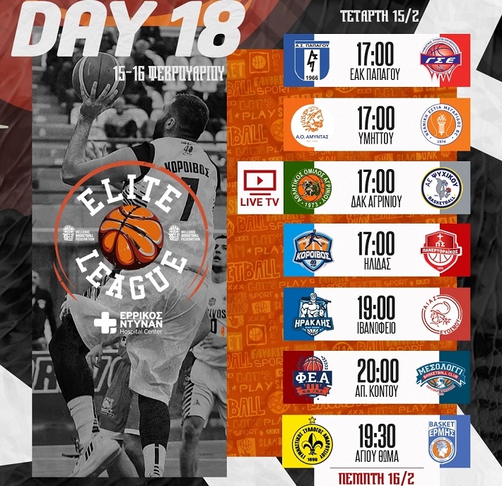 Αναλυτικά το πρόγραμμα της 18ης αγωνιστικής της Elite League :