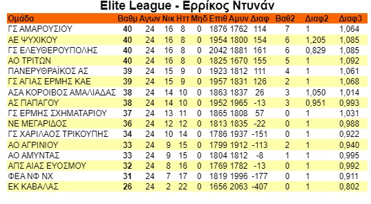 Η απόλυτη ισορροπία κυριαρχεί στην βαθμολογία, και στις θέσεις των πλέι οφς της Elite League, με τέσσερις ομάδες να ισοβαθμούν στην κορυφή, μετά την ήττα που υπέστη το Μαρούσι από τον Αμύντα, ενώ υπάρχει διπλή ισοβαθμία στις θέσεις 5-6 και 7-8.