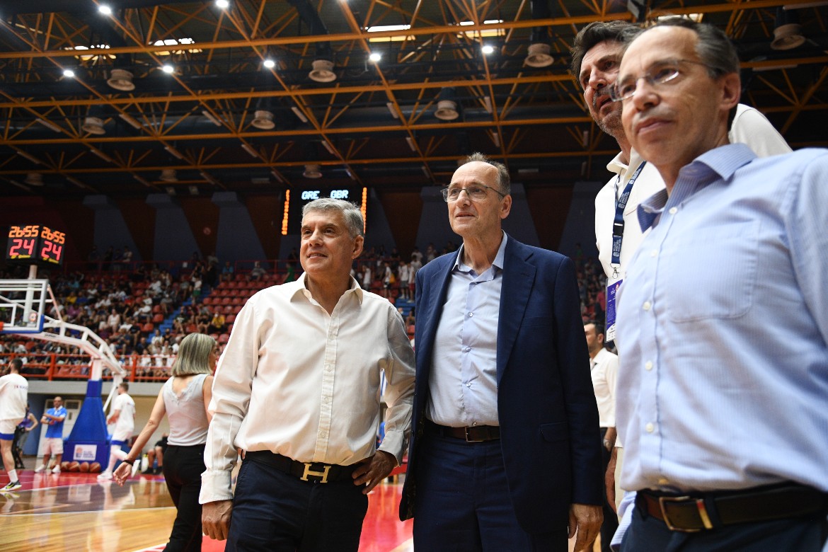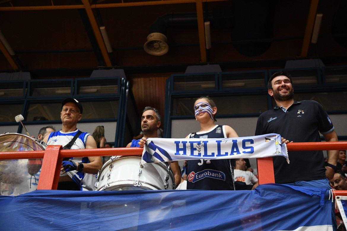 * Η ανάκρουση των δύο ύμνων υπό την αποθέωση για την ελληνική ομάδα από το γεμάτο Κλειστό της Νεάπολης