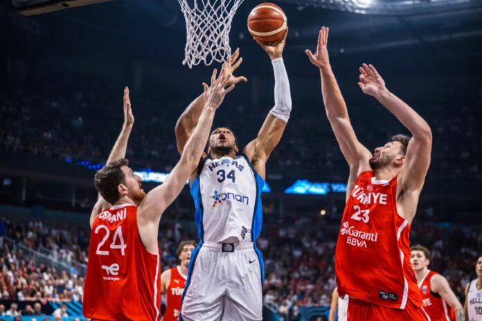 Η Εθνική ομάδα έχει κάνει ένα νευρικό ξεκίνημα στον ημιτελικό του Ευρωμπάσκετ απέναντι στην Τουρκία, αλλά ο Γιάννης φρόντισε να καρφώσει μπροστά τους δύο ψηλούς αντιπάλους.