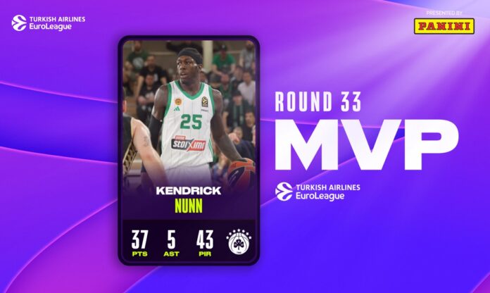 Ο Κέντρικ Ναν αναδείχθηκε MVP της 33ης αγωνιστικής της Euroleague χάρη στην εκπληκτική του εμφάνιση απέναντι στην Μονακό, κερδίζοντας το βραβείο για τρίτη φορά τη φετινή σεζόν.