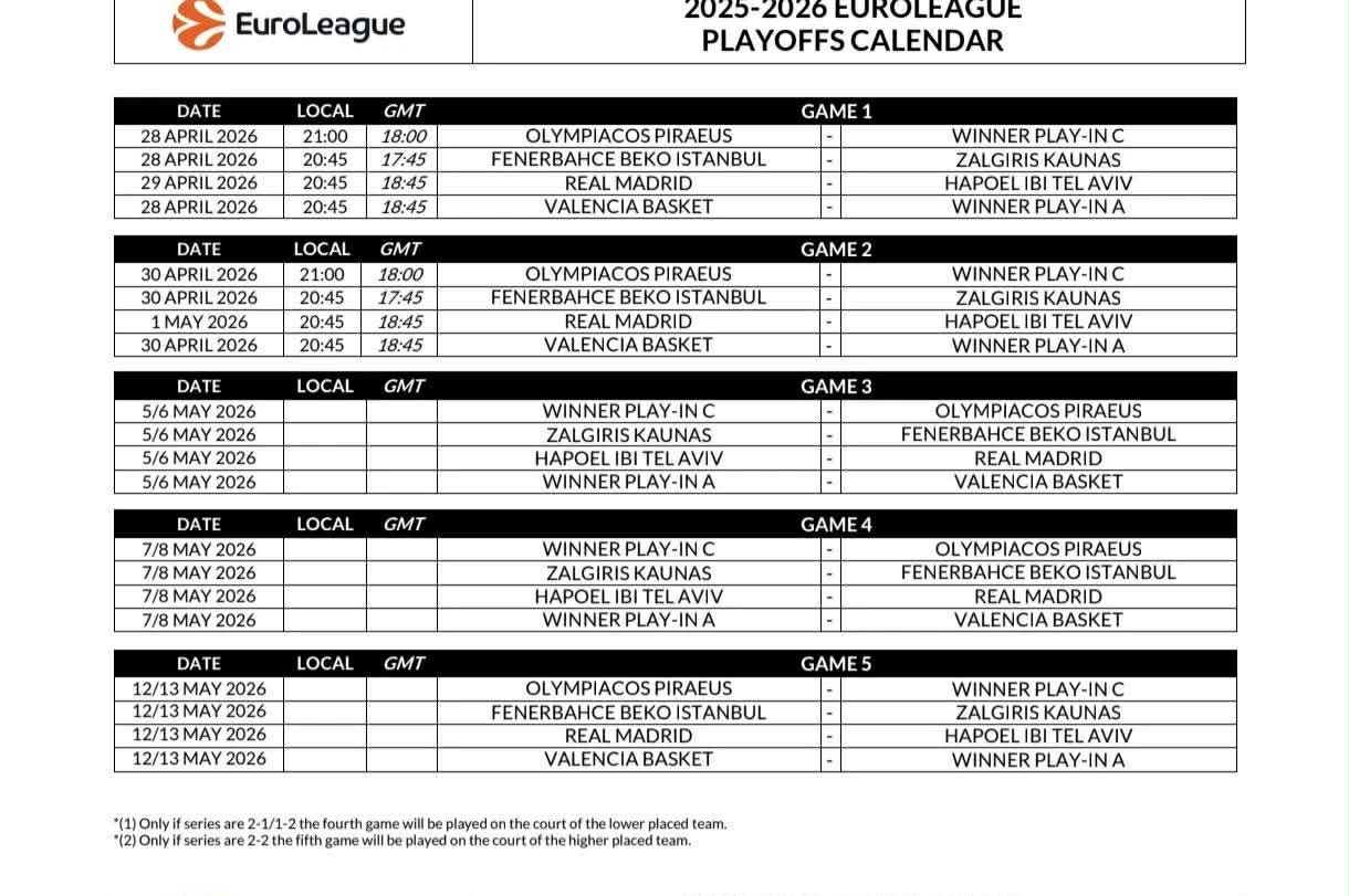 Το σίγουρο, πάντως, είναι ότι σε κάθε περίπτωση οι δύο «αιώνιοι» θα αγωνίζονται την ίδια μέρα, είτε χωριστά είτε μαζί, με τη διοργανώτρια αρχή να γνωστοποιεί το πρόγραμμα. Στις 28 και τις 30 Απριλίου, συγκεκριμένα, ο Ολυμπιακός με την 8η ομάδα και η Βαλένθια με την 7η θα αναμετρηθούν την ίδια μέρα, κάτι που σημαίνει πως η ελληνική δράση θα είναι... πλήρης, ενώ μονάχα η Ρεάλ και η Χάποελ θα αγωνιστούν διαφορετική ημέρα σε σχέση με τα υπόλοιπα ζευγάρια, ήτοι στις 29 Απριλίου και την 1η Μαΐου.
