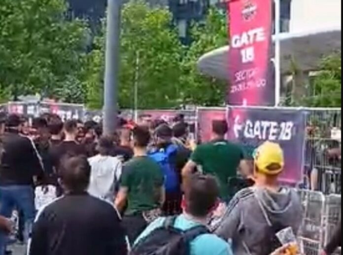Όλα κυλούσαν ήρεμα έξω από την «Uber Arena» όταν Τούρκοι οπαδοί της Φενέρμπαχτσε έφτασαν με πορεία στο γήπεδο και προσπάθησαν να κάνουν «ντου» για να εισέλθουν σε αυτό, δίχως να έχουν στην κατοχή τους εισιτήρια.