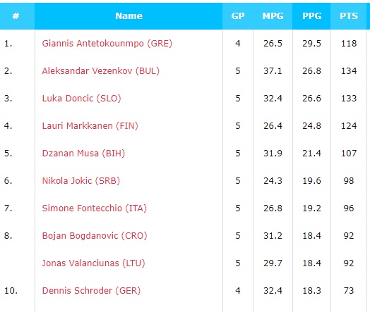 Ο Γιάννης Αντετοκούνμπο αναδείχθηκε πρώτος σκόρερ της πρώτης φάσης, έχοντας 29,5 πόντους κατά μέσο όρο σε 4 παιχνίδια, με τον Σάσα Βεζένκοφ της Βουλγαρίας να ακολουθεί με 26,8 πόντους.