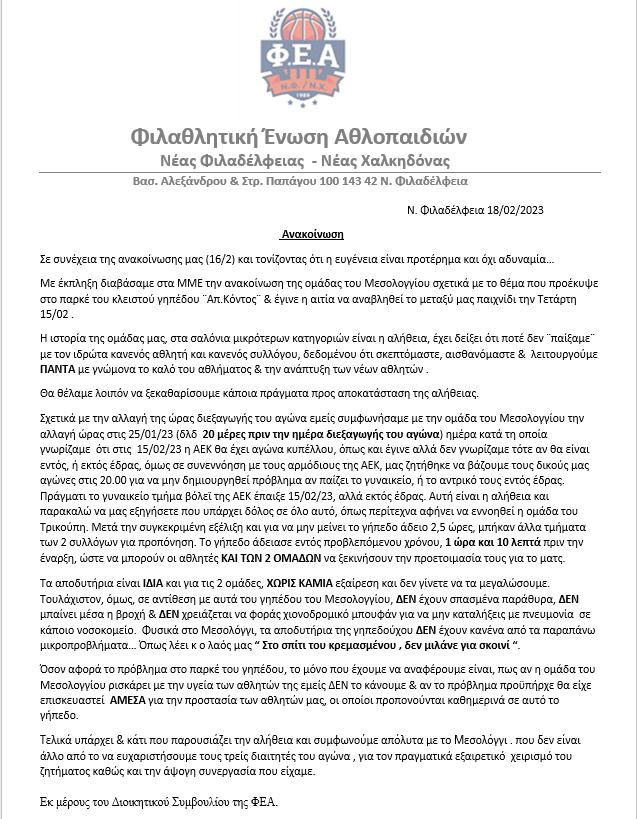 Συνεχίζεται μέσω ανακοινώσεων η «δράση» ανάμεσα σε ΦΕΑ και Μεσολόγγι, και από τη στιγμή που δεν υπήρξε αγωνιστική δράση λόγω του προβλήματος στο παρκέ του «Απ.Κόντος».