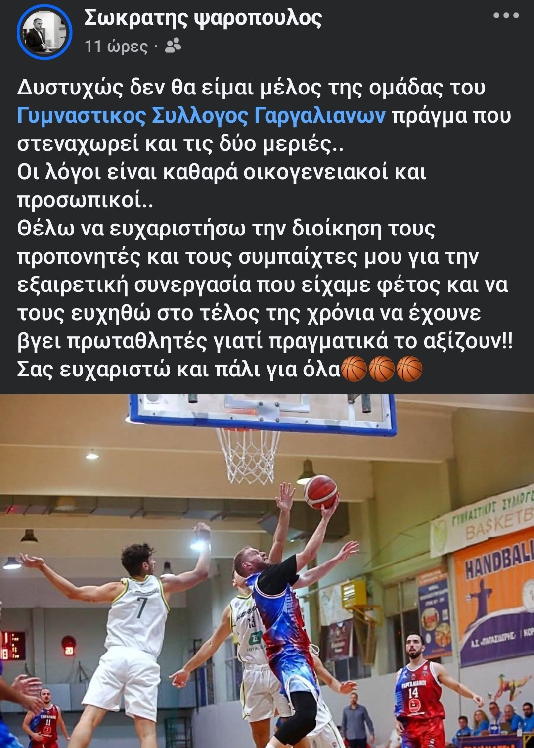 «Δυστυχώς δεν θα είμαι μέλος της ομάδας του Γυμναστικος Συλλογος Γαργαλιανων πράγμα που στεναχωρεί και τις δύο μεριές..