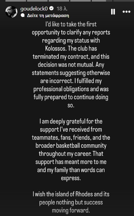 «Θα ήθελα να πάρω την ευκαιρία και να ξεκαθαρίσω τις αναφορές που υπάρχουν για τη σχέση μου με τον Κολοσσό. ΤΟ κλαμπ τερμάτισε το συμβόλαιό μου και αυτή η απόφαση δεν ήταν κοινή. Κάθε αναφορά περί του αντίθετου είναι λανθασμένη.