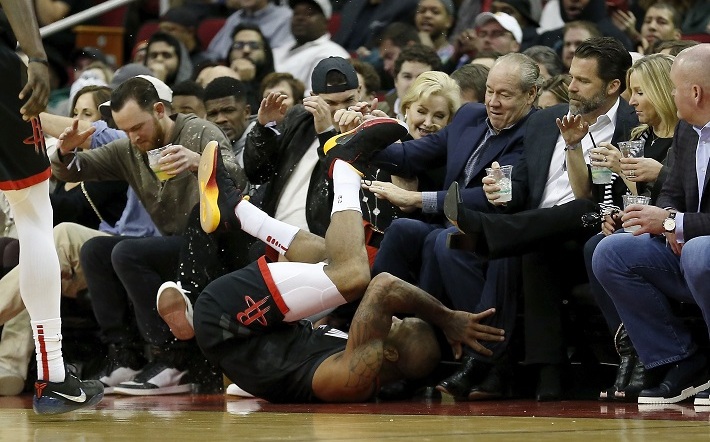 Ο Πι Τζέι Τάκερ γλίστρησε εκτός παρκέ, με αποτέλεσμα να… κεράσει μπίρα τον Άλεξ Μπρέγκμαν που καθόταν στην μπροστινή σειρά της κερκίδας του «Toyota Center».