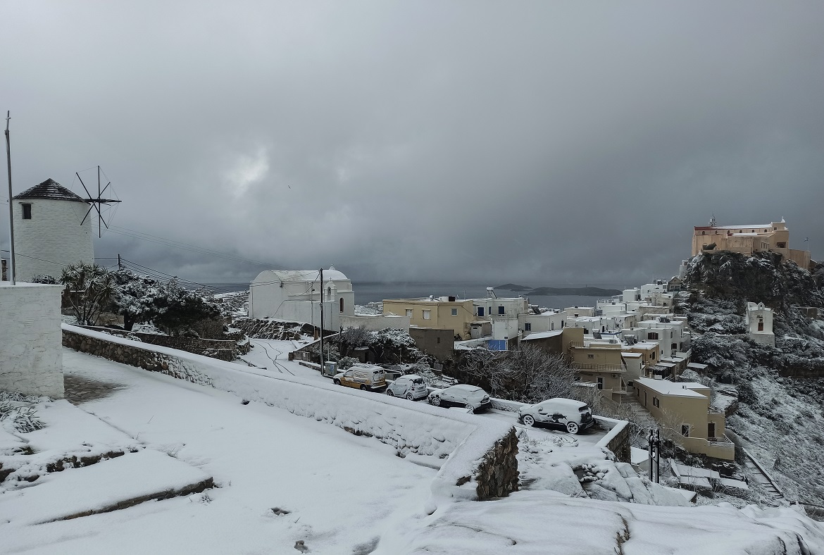Η Ανδρος, η Νάξος και η Μύκονος είναι στο... φόρτε της χιονόπτωσης, όπως επίσης χιόνια υπάρχουν στην Τήνο, την Αμοργό, τη Σύρο, τα πολύ ορεινά της Πάρους και αλλού.