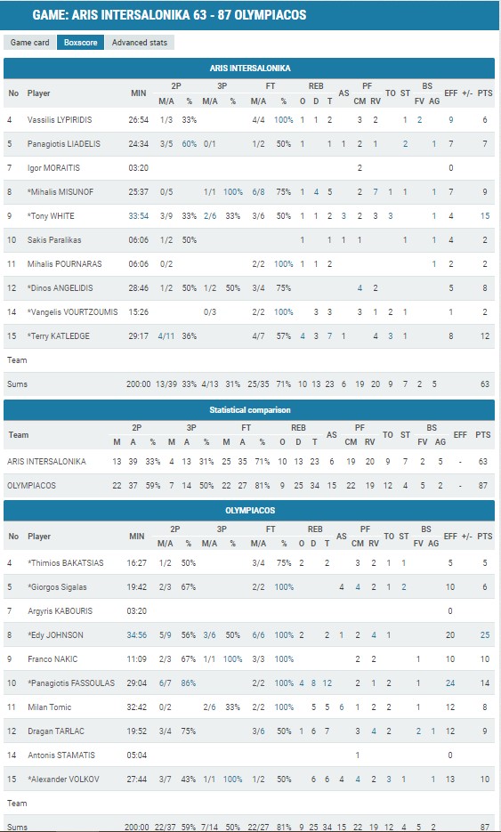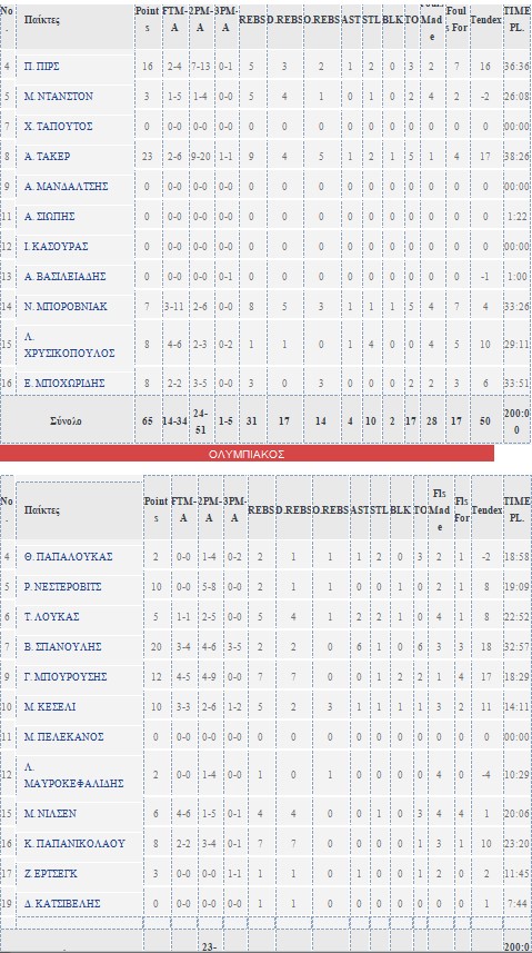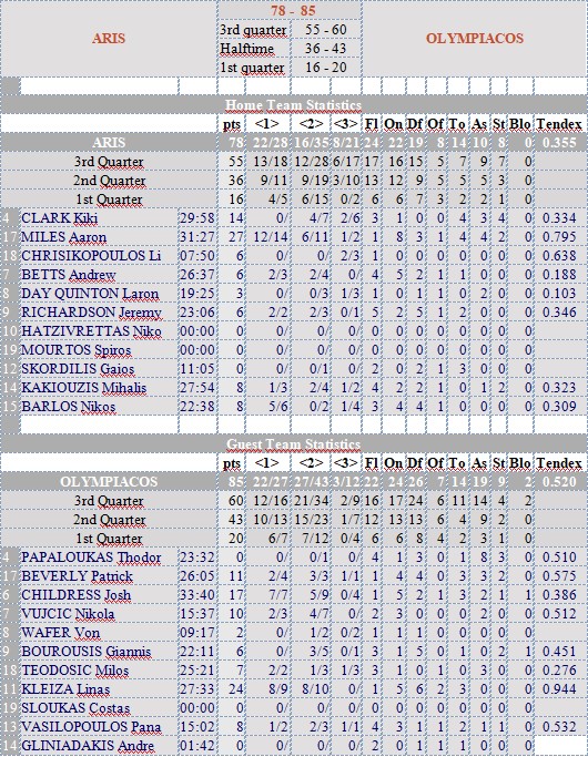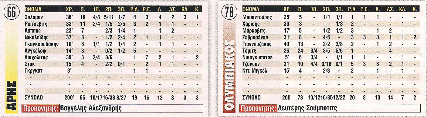 Ο Ολυμπιακός με τον Ντούσαν Ίβκοβιτς στον πάγκο, του οποίου οι παίκτες δεν συμμετείχαν στην αποχή του ΠΣΑΚ, δεν έφτασε τόσο εύκολο όσο αναμενόταν στην επικράτηση (65-78) έχοντας κορυφαίο τον Βασίλη Σπανούλη που είχε 20 πόντους στο ντεμπούτο του με τους «ερυθρόλευκους» στο Πρωτάθλημα. Για τον Άρη που είχε προπονητή τον Ισραηλινό Σαρόν Ντρούκερ, ο επί σειρά ετών -στη συνέχεια- ΝΒΑερ Πι Τζέι Τάκερ, είχε 23 πόντους.