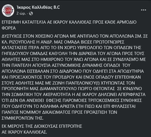 Ίκαρος Καλλιθέας: «Άνθρωποι του Απόλλωνα επιτέθηκαν στους αθλητές μας με ζώνη παντελονιού και χτύπησαν τον προπονητή μας» (pic)